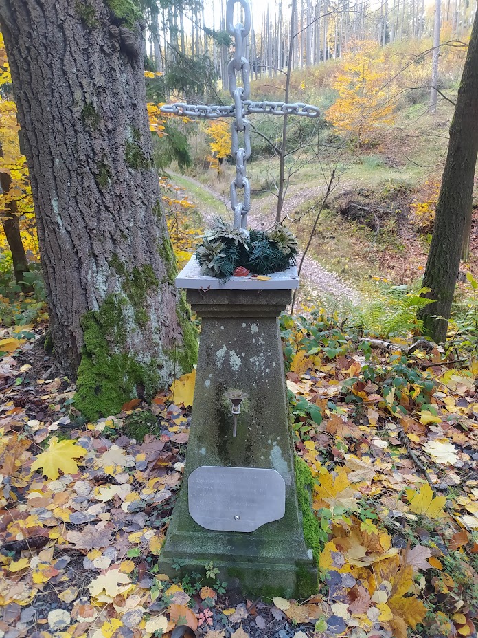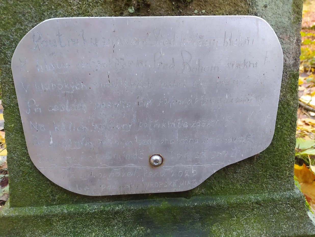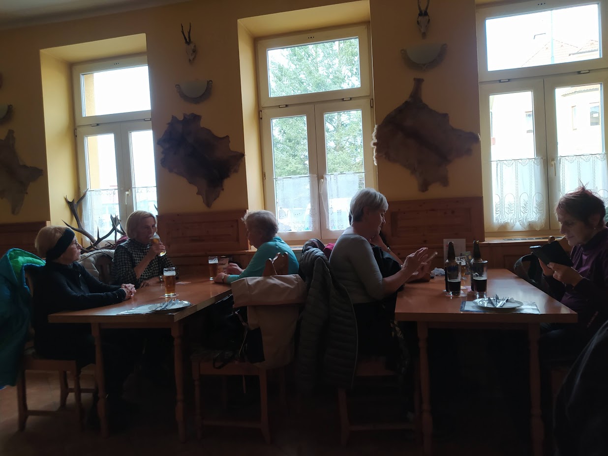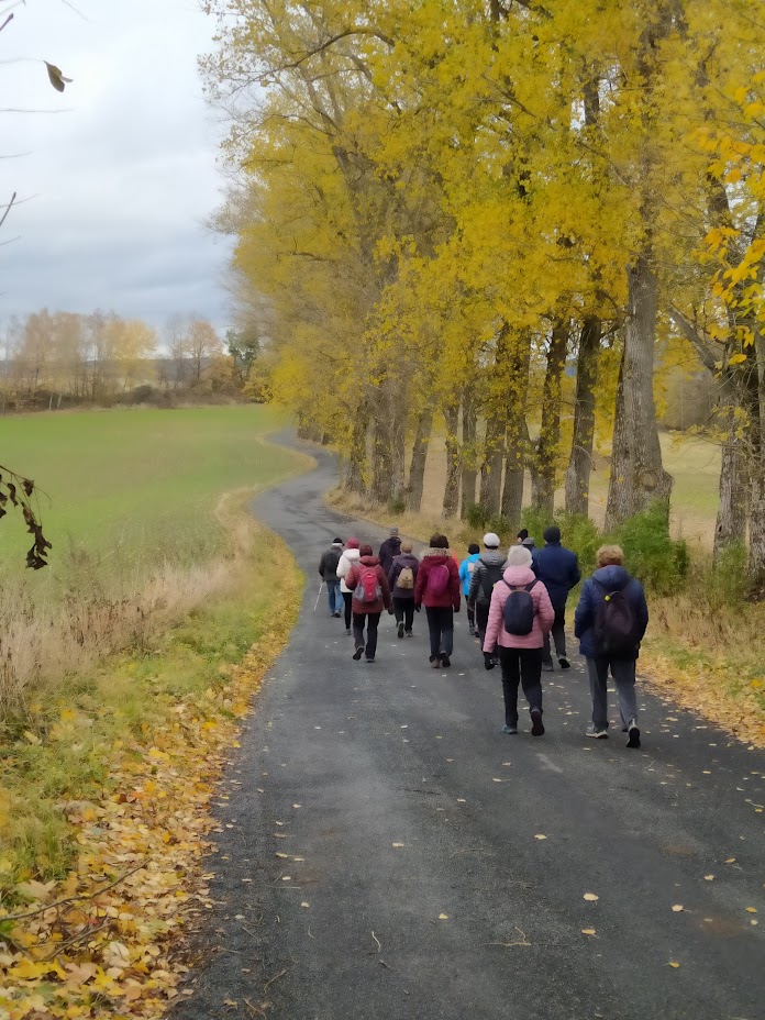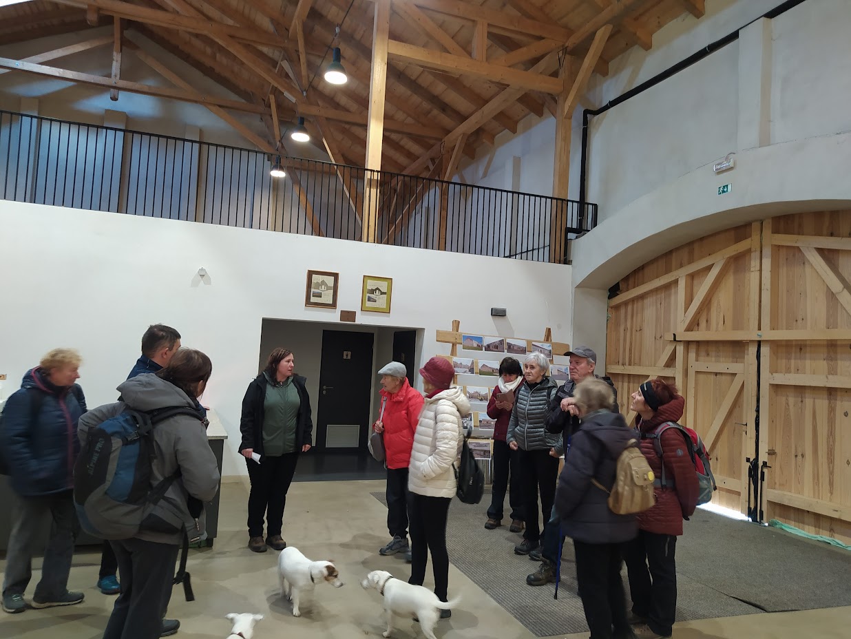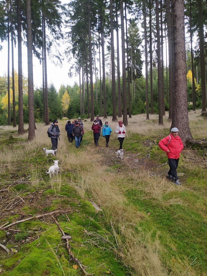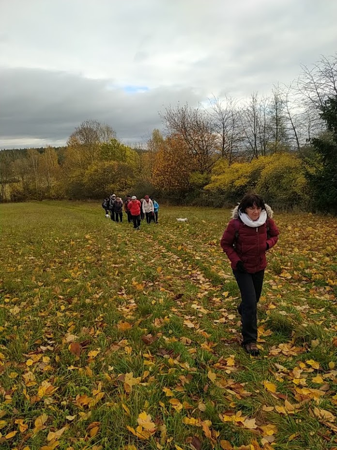 Dnešní vycházkovou trasu prošlo 14 vandrovníků a 3 psi. Celkem jsme ušli cca 10 km. První starostí po nastoupení do vláčku motoráčku bylo zajištění menáže. Výsledkem bylo 10 "vepřových rozlítaných ptáčku" a 2x "zapečené těstoviny". To vše bylo telefonicky zajištěno u paní Bukovské v Bělé n. R.. Výlet jsme započali v Újezdě sv. Kříže a postupně stoupali kolem Lískovecké Hůrky a míjeli Lískovec, kde jsme dostoupali do výšky 737 m n. m. Za tento počin jsem sklidil pár pochvalných slov typu: "Kdybych to byl věděl, tak jsem sem nechodil". Další pochvalná slova jsem vyslechl po svačině, kdy někteří jedlíci poseděli na vlhkém mechu a po nabytí energie jsme pokračovali v chůzi a asi po 400 metrech jsme míjeli dřevěný altán s lavicemi. Ale bylo dostoupáno a pak jsme převážně již jen brzdili. V obci Bystřice jsme si se zájmem prohlédli stádečko lam včetně mláďat. Drželi jsme od nich dostatečný odstup se znalostí, že dobře plivou. Plivání je u lam projevem obrany a zastrašování. Také si rád odplivnu, když se leknu. Vidina jídla zvítězila jako první před návštěvou Stodoly. S vědomím, že hmota podporuje myšlení, jsme jednomyslně tento postup odhlasovali. Návštěvu Stodoly jsme zavčasu domluvili s Blankou Triščovou a obdivovali její z mrtvých vstání, myslím té Stodoly, aby mne někteří neobvinili z morbidity. Protože k odjezdu vlaku zbýval dostatek času, nebylo zbytí a navštívili jsme Medovou cukrárnu. Sedící hosté, uzříc tolik osob s holemi, kvapem kavárnu opouštěli. Alespoň bylo kam si sednout. Spousta žen si odnášela zabalené zákusky s sebou řka: "To je pro mého milého manžela". Moc jsem jim to ale nevěřil. Předpokládám, že to snědli ještě v garáži, aby je jejich drahá polovička neviděla. Celý den jsme měli problém pořídit společné foto. Nakonec, s neúplným obsazením, se to zdařilo v cíli cesty na autobusovém nádraží v Domažlicích. Historii bylo zadostiučiněno.